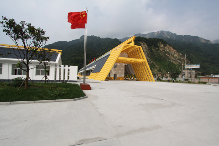 完工后的樞紐格外雄偉壯觀,我們把廢墟中那三面特別的旗幟,永久地矗立在新的廣場上。當人們走過綿竹漢旺地震遺址紀念地來到這里,一幅藍天白云、青山綠水與工程和諧相處的畫面,與遺址印象產生強烈反差,形成視覺上的沖擊與心靈上的震撼。風雨過后,這里的旗幟分外艷麗!
