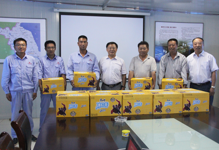 87上午,揚州市建設工會主任田紀榮一行領導在公司黨委副書記、工會主席姜啟生陪同下,來到引江河二線船閘施工現場,代表市總工會看望慰問公司的廣大建設者,給高溫下作業的一線員工送來了清涼飲料