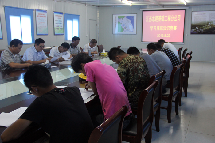 為響應(yīng)省水利廳關(guān)于《加強(qiáng)質(zhì)量強(qiáng)水建設(shè)的指導(dǎo)意見》的通知精神,迎接公司開展2013年“質(zhì)量月”活動(dòng),達(dá)到全員自覺參與質(zhì)量管理、提高工程質(zhì)量管理水平的目的,基礎(chǔ)工程分公司5~8月份組織開展了“學(xué)習(xí)規(guī)范”知識(shí)競賽活動(dòng)。根據(jù)工程分散、人員不能相對集中的情況,基礎(chǔ)工程分公司通過發(fā)動(dòng)宣傳、組織學(xué)習(xí)、分片考試等形式,組織人員學(xué)習(xí)質(zhì)量管理知識(shí),檢驗(yàn)學(xué)習(xí)教育成效。目前,活動(dòng)第一季——《建筑樁基技術(shù)規(guī)范》(JGJ94-2008)知識(shí)競賽于