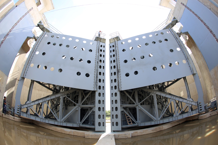 該工程閘門采用桁架式弧形三角門,自2012年9月開工以來,水機(jī)公司項(xiàng)目部員工克服工期緊、任務(wù)重等困難,按照淮委對(duì)按期形成防洪線的要求,優(yōu)質(zhì)高效地完成了閘門制造安裝任務(wù),確保了工程安全度汛。