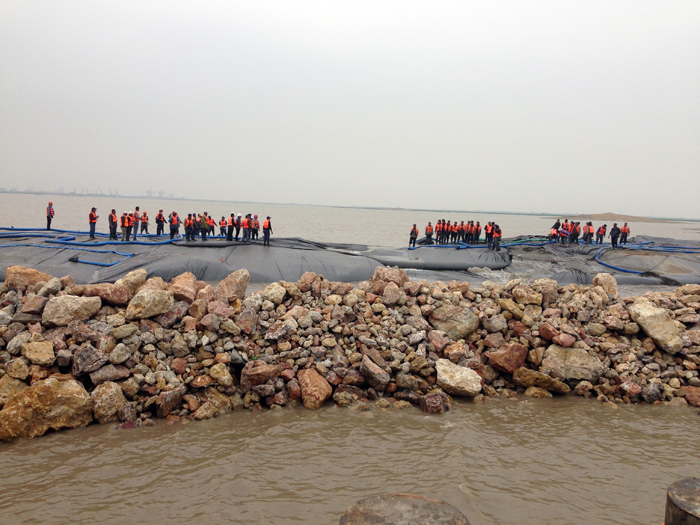 該工程自20131219開工以來,在常熟市政府的統一組織下,在業主、項目總承方、監理方及社會各界的大力支持和協調下,項目部克服水上作業活動多、安全要求高、航道吃水深度不足、施工強度大、采砂難、運距遠、趕潮施工等諸多不利因素,分公司副經理、項目經理高桂章帶領施工項目團隊攻堅克難,精心組織,優化方案,狠抓細節落實和安全管理。合龍時分公司領導葛年平、吳寶華現場指導,順利完成了龍口合龍。合龍后項目部繼續24小時不停機對龍口斷面加高培厚,確保龍口安全。