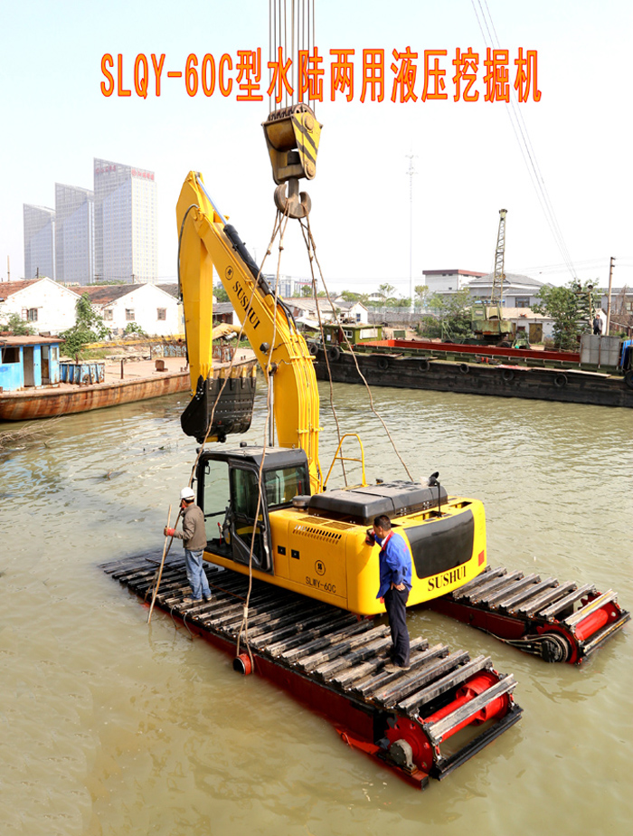 5月8日上午10時,水機公司最新研制的SLQY—60C型水陸兩用液壓挖掘機在公司專用碼頭完成了水中航行、平衡試驗、挖泥測試后被緩緩吊出水面,碼頭上鞭炮齊鳴,產品研發人員、安裝工人歡聲雷動,祝賀公司二0一四年第二個新產品制造成功。新型水陸兩用液壓挖掘機采用進口發動機和液壓驅動系統,臂長達11.5米,與同類機型相比具有水陸兩用性能可靠、挖掘半徑大、功效高、驅動力大、維修方便等特點,是河道開挖、工地施工的首選機型。