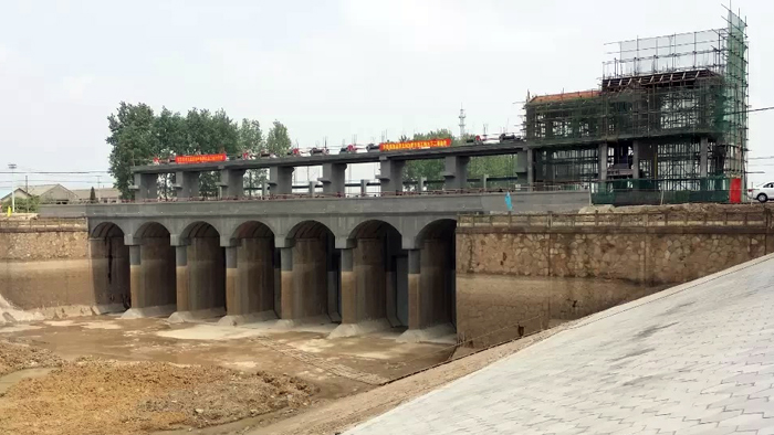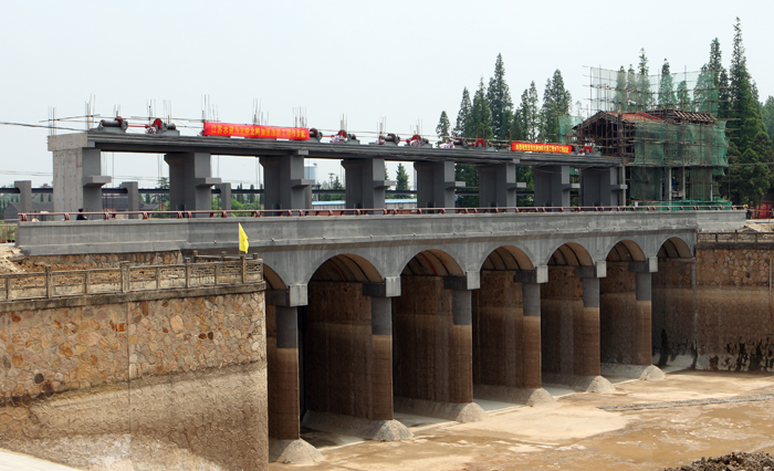 宜陵北閘位于江都宜陵鎮(zhèn)北三陽河與新通揚運河的交匯處,是里下河地區(qū)引排主要控制建筑物。主要功能為向里下河水網(wǎng)供水,排澇,攔截三陽河來草,減輕江都東閘清污機的撈草壓力。該閘建于1975年,設計流量300m3/s,共7孔。2007年5月省水利廳組織的安全鑒定結論認為:該閘建成運行30余年,現(xiàn)狀存在工程結構老化,底板、閘墩、工作橋排架強度不滿足抗震要求,公路橋設計標準低、砼閘門裂縫漏水、電氣設備老化、管理設施陳舊等問題。為消除工程安全隱患,確保工程運行,對宜陵北閘進行除險加固。本次加固改造施工主要對底板及閘墩加固、胸墻拆建、增設撐梁、工作門門槽改造、公路橋拆建、工作便橋整修、工作橋及排架拆建、混凝土防碳化處理、上下游護坡整修、增設三陽河側攔污設施、起吊排架更換閘門啟閉機、新增檢修閘門、門槽埋件更新改造、活動門擋更換、攔污柵改建、新作支擋結構埋件;橋頭堡拆除,新建橋頭堡基礎等。
