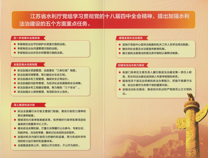 近日,公司黨委按照省廳黨組的統一部署,陸續發放了“黨的十八屆四中全會精神圖解”宣傳圖冊,把學習活動進一步引向深入。《圖解》提挈了《中共中央關于全面推進依法治國若干重大問題的決定》要點,同時,結合水利行業實際,提出了加強水利法制建設的五個方面重點任務。對廣大水利一線員工以十八屆四中全會精神為指導,進一步推動水利新發展提出了新的要求。
