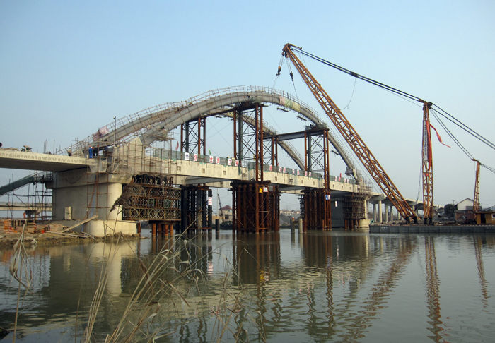 港口公路橋全長451.6米,主跨為85米鋼管系桿拱結構,引橋為20米預應力空心板梁。主跨采用三跨四支點施工工藝,支點處現澆濕接頭,最后整體張拉,成橋后拆除四個臨時支點。自2011年11月開工以來,項目部在公司各級領導的關心支持下,狠抓工程施工管理,優化施工工藝,解決多種技術難題,減小了施工難度,節約了施工成本,降低了安全風險,保質保量保安全完成工程任務。