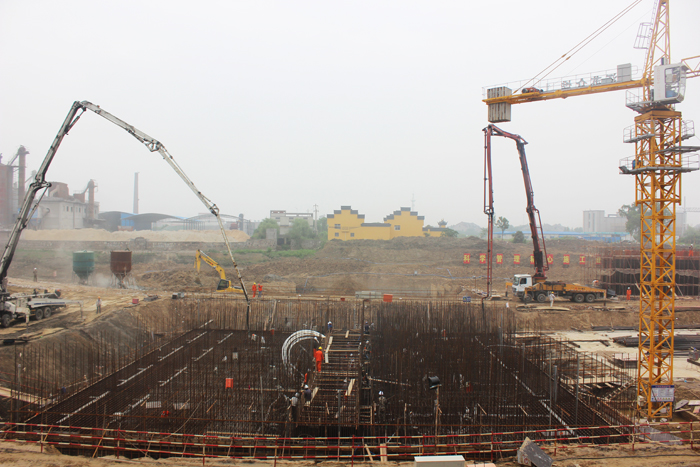 該工程泵站設(shè)計(jì)流量60m3/s,安裝豎井貫流泵機(jī)組4臺(tái)套,不設(shè)備用機(jī)組;站內(nèi)4臺(tái)機(jī)組呈一列式布置,設(shè)置一塊底板。底板尺寸(長(zhǎng)×寬)分別為31.5米×32.1米,厚1.5米,本次澆筑混凝土1800多方。