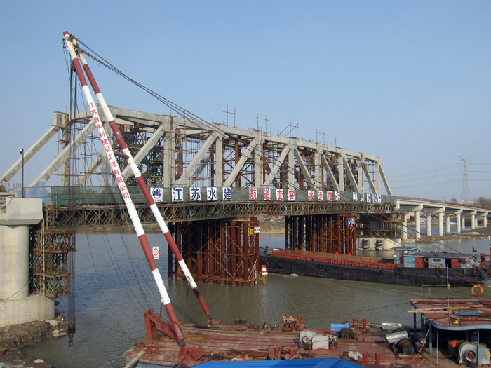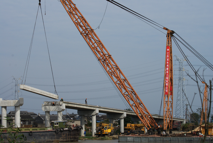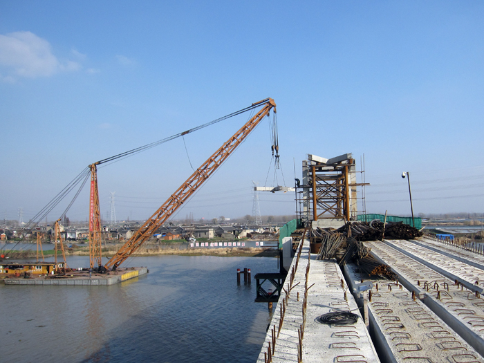2013年2月1日,經(jīng)過全體項目人員的不懈努力,南水北調(diào)泰州市鹵汀河跨河橋梁董潭生產(chǎn)橋主跨順利合龍,春節(jié)前圓滿完成全橋貫通目標。目前董潭生產(chǎn)橋已經(jīng)初展雄姿,宛如一條白色的長龍靜臥在鹵汀河上。