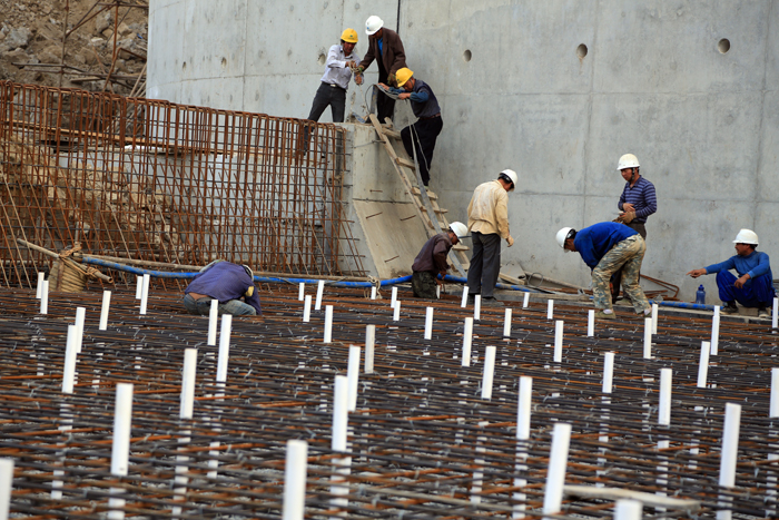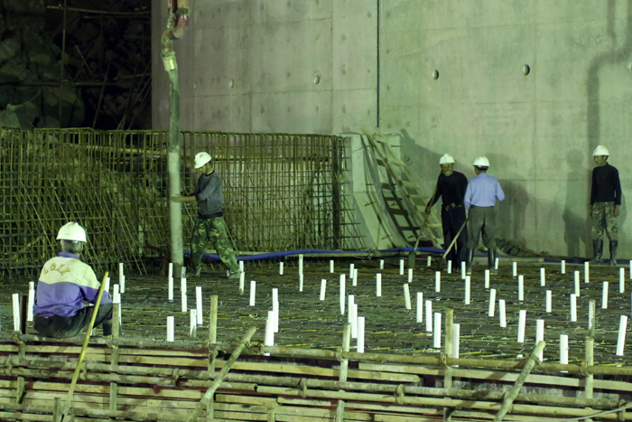 工人們加緊綁扎最后兩塊消力池底板鋼筋,預計今明兩天澆筑完成