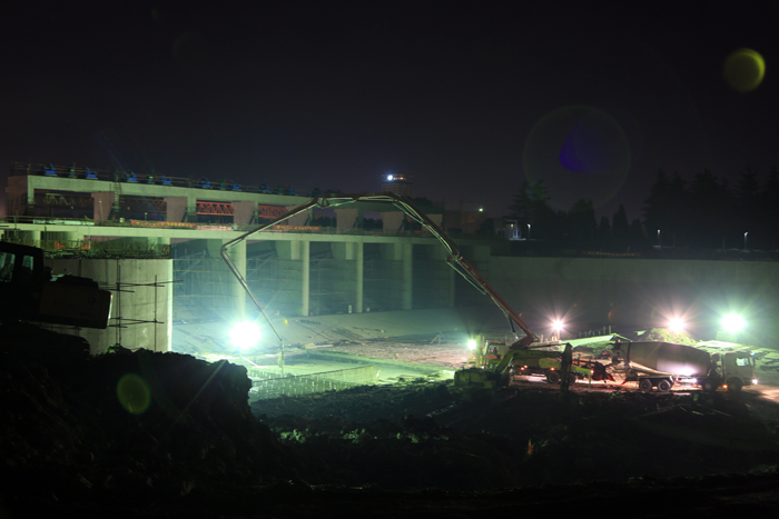 “下一步我們將集中精力完成最后一塊消力池澆筑,翼墻墻后回填土填筑,補齊上下游護坡護底,以及加緊進行閘門、啟閉機和小水電電機安裝調試,預計到520日可基本完成全部水下工程,為提前實現通水驗收目標創造有利條件?!表椖拷浝砝钚潞8嬖V記者。記者注意到,李經理黝黑的臉龐上充滿著自信的笑容。而在項目總工周海銀心里更有一筆帳:“泗陽閘工程從正式開工到現在,3個多月時間,拆掉一座老閘,新建了一座7孔(孔寬10m)的節制閘和兩孔小水電,完成砼近30000方。高峰期投入近500號人,模板近20000平方米,鋼管900余噸,扣件10多萬只。人員和周轉材料的投入是類似正常工程的兩倍以上。近一個多月來,工作面全面打開后,每天都是兩臺以上泵車在澆筑混凝土,連續有上百個小時的澆筑強度。”超常規的投入保證了搶工的需要,但大量的人力物力帶來的是工程更周密的計劃、更繁瑣的安排、更嚴格的考核。項目部兩天一次生產會,主要管理人員每天至少一次碰頭會,一切都按計劃有條不紊的進行。所有人員都按照計劃按時按點的堅守崗位,只能提前,不能落下,特殊部位調整時必須把時間再搶回來。